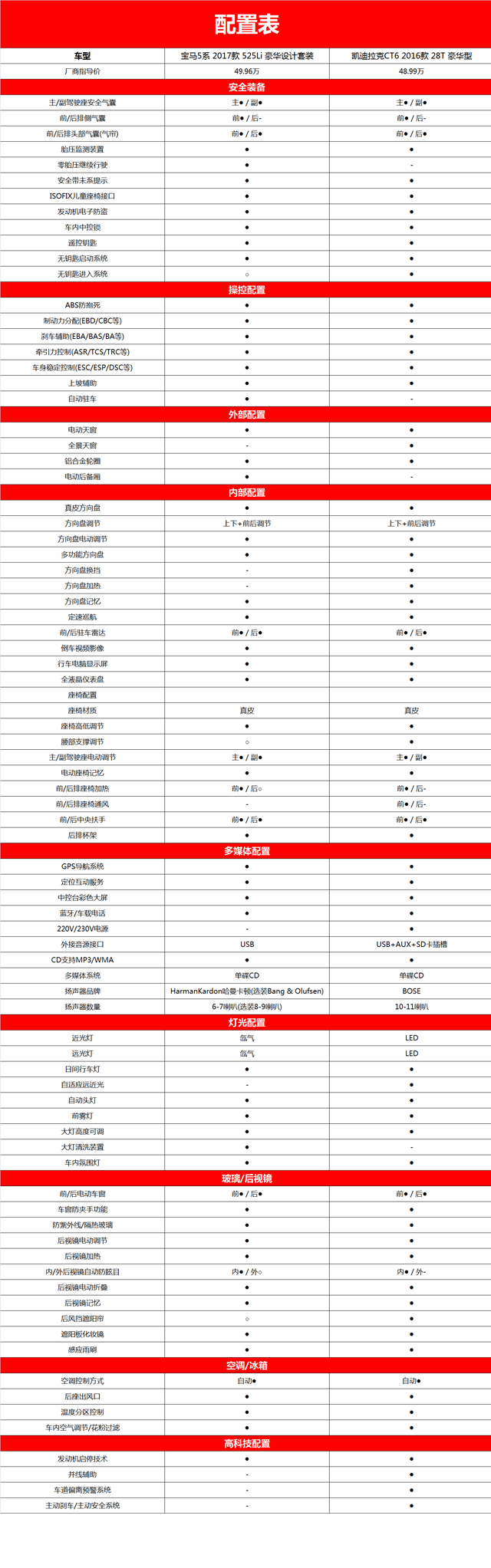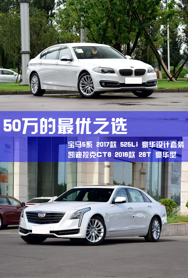 基于以上的分析看来,在40-50万区间,选择宝马5系还是凯迪拉克CT6就是一个无法绕开的问题了。我们试着以宝马5系 2017款 525Li 豪华设计套装以及凯迪拉克CT6 2016款 28T 豪华型作例,通过横向对比分析当中的产品差异。