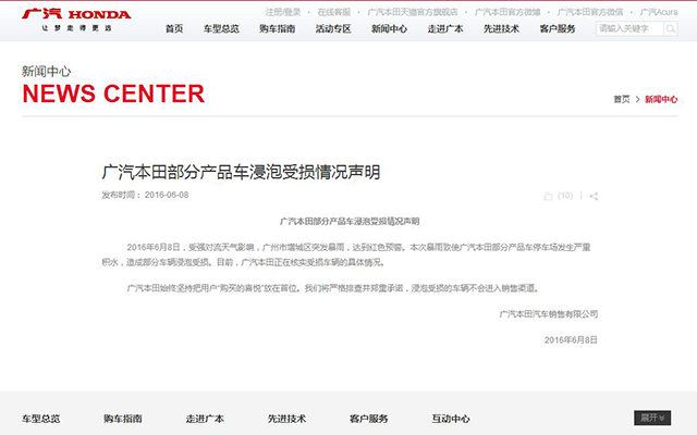 对于6-7月降水量巨大的广州来说,位于广州市增城区的广汽本田也受了很大伤害,网上流传着许多广本车辆浸泡在充满泥沙的雨水中的照片,还有当场正在清理积水的广本工作人员。