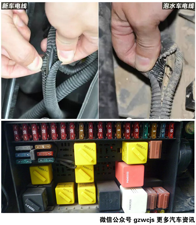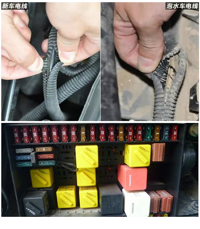4.观察发动机舱线束和保险丝盒内是否有泥沙污垢,同样的,对于发动机舱工作人员也会吹干清洁,但是线束包扎处里面,清理难度比较大,也会积累一些少量泥沙,而保险丝盒里面的插槽缝也是一样的道理。