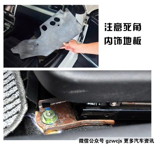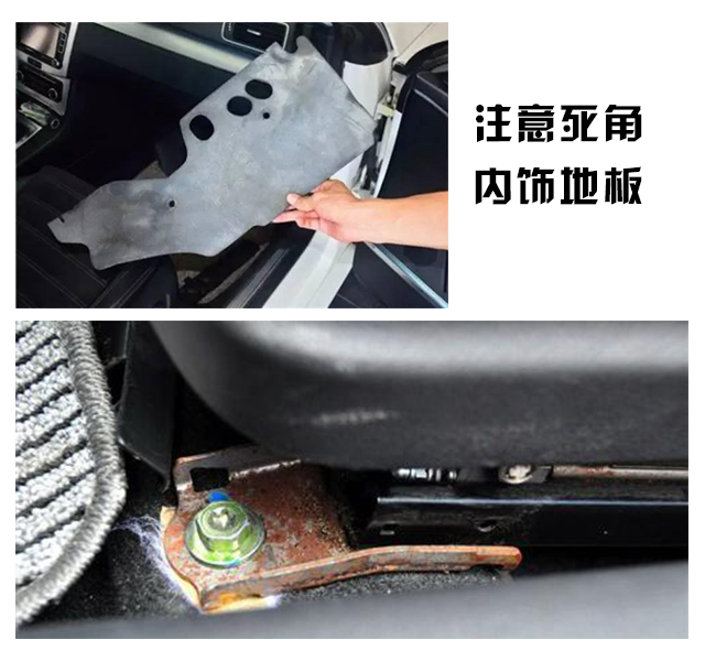 3.观察内饰底板死角位置是否有泥沙,虽然说泡水车处理的时候,工作人员会拿出地板胶等东西,做一些全新的风干和清洁,但是难免死角的地方还会残留一点泥沙,这个需要细心观察。