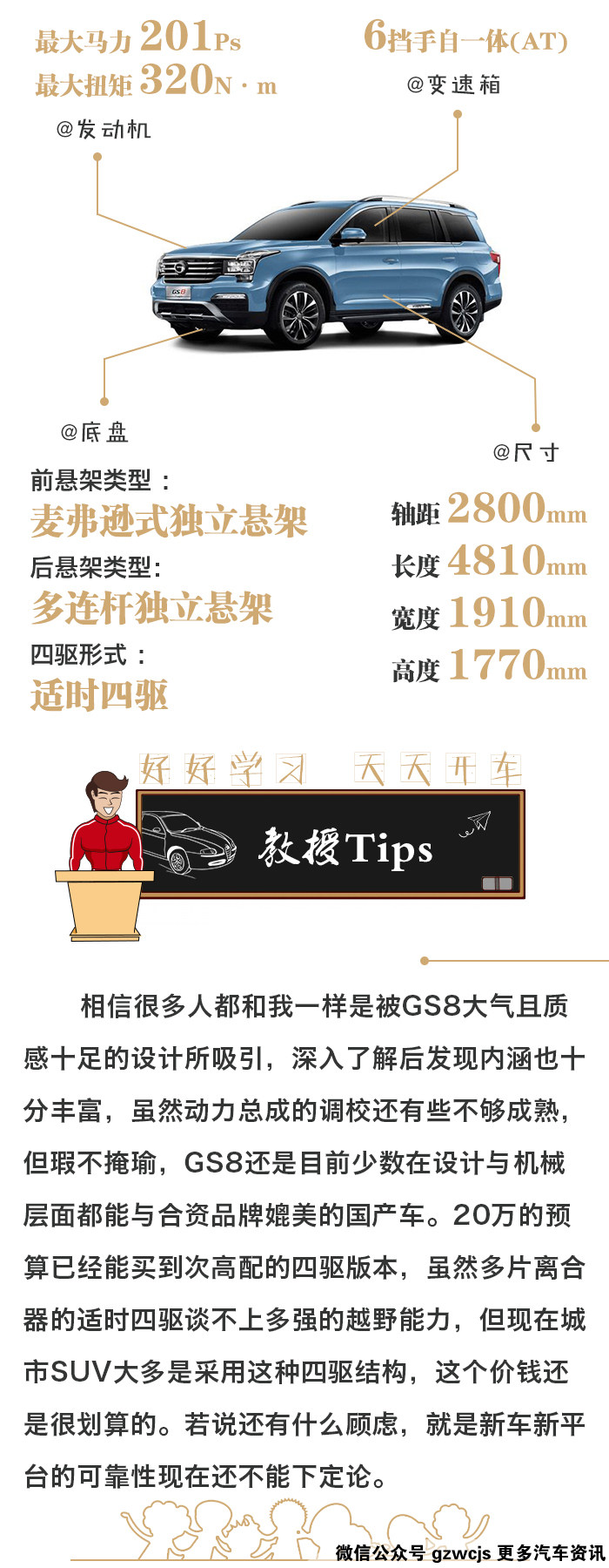 和其他国产车一样,GS8的配置也相当厚道,在这里罗列了我觉得比较实用的八项配置,全景天窗真的很敞亮,胎压监测开着放心,定速巡航高速省事,全景摄像头挪车很实用,车内氛围逼格满满,座椅通风加热则是为屁股着想。这些配置在这款320T四驱豪华智联版上均有配备,但其中只有定速巡航是全系标配的,所以为了四驱和这些配置,20万买个高配还是物有所值的。