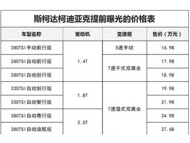 看回这个价格,柯迪亚克现在提供1.4T,1.8T和2.0T高低功率三个版本的发动机,1.4T的尾标为280TSI,1.8T尾标为330TSI,2.0T为380TSI。从这张流出的价格表可以知道1.4T匹配5MT变速箱的手动版本车型价格为16.98万元,匹配7速双离合变速箱的1.8T车型售价为19.98万元。