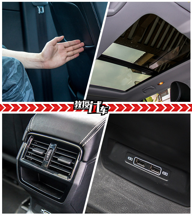 不使用第三排座椅的条件下,将第二排座椅调至最后位置,得到与途观L一样非常宽松的腿部空间,头部空间超过一拳,表现十分不错,第二排座椅靠背可调,第二排空调出风口,两个USB充电口,再加上全景天窗的开扬感,舒适性和实用性都很不赖。