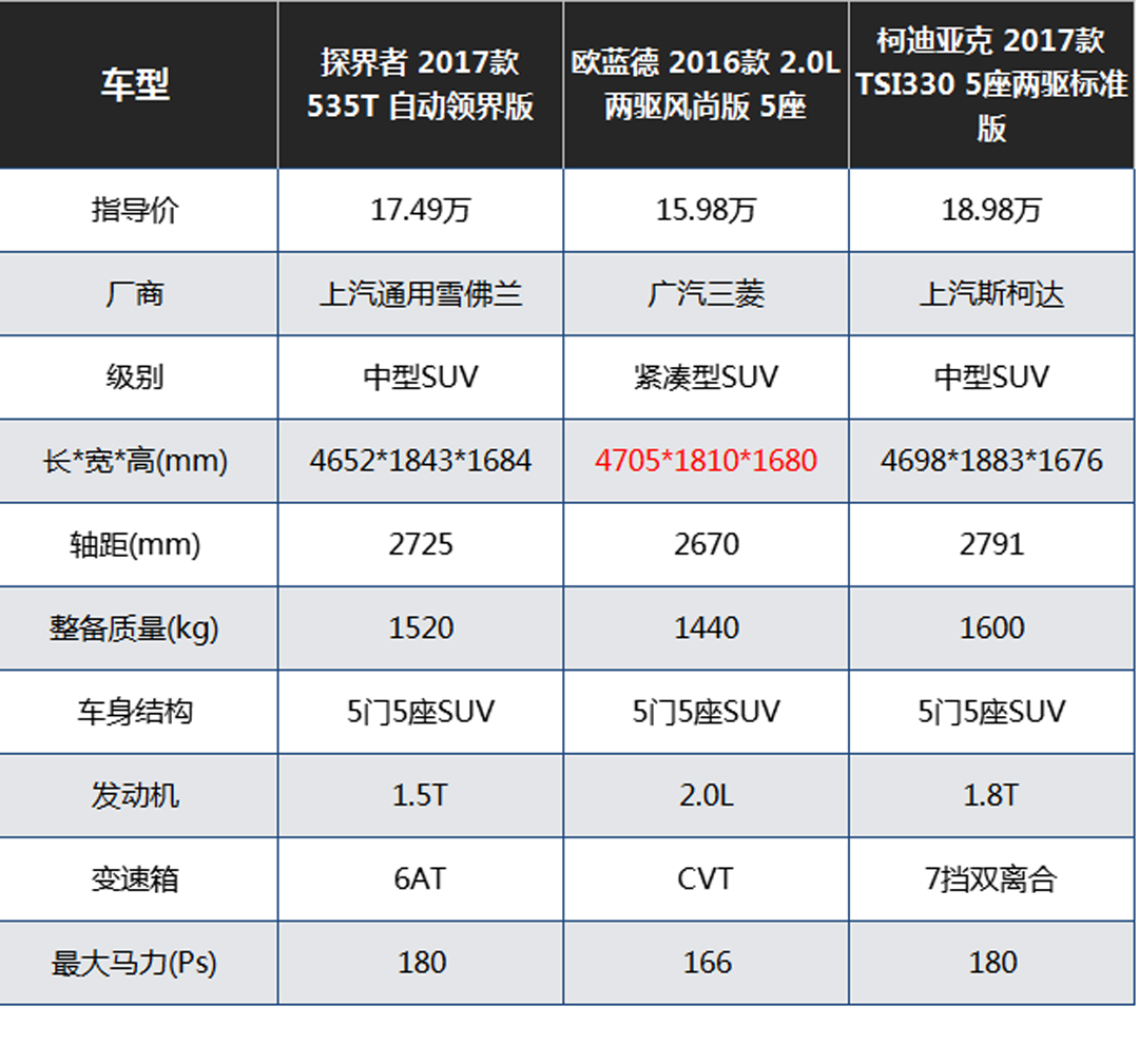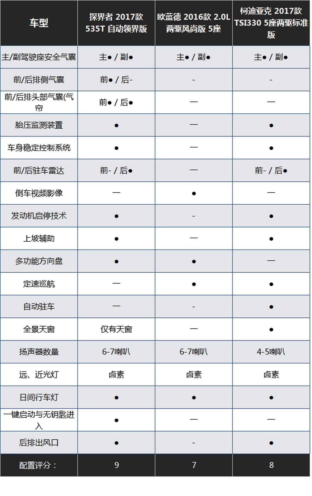 总结:就纯粹低配车实用性来看,欧蓝德的入门车型则差点意思;无论是安全配置还是舒适配置都不太过关;不过限于其15.98万价格也说得过去,要想实用性则推荐更高一级的2.4L精英版车型。另外的探界者与柯迪亚克虽然仅是入门车型,但配置则完全符合日常的需求;就是价格稍微高了点特别是有加价嫌疑的柯迪亚克。