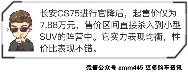长安CS75在前段时间进行了一波强势的官方降价,全系车型价格下调14000元,如今它的售价很具有诱惑力!它设计偏向成熟稳重,车内乘坐空间也比较充足。在行驶方面它以舒适、惬意为主,悬架调校也善于过滤震动,而在动力总成方面,由于荣威RX5等强动力车型的推出,相比之下长安CS75的动力及油耗属这一级别的中等水平。