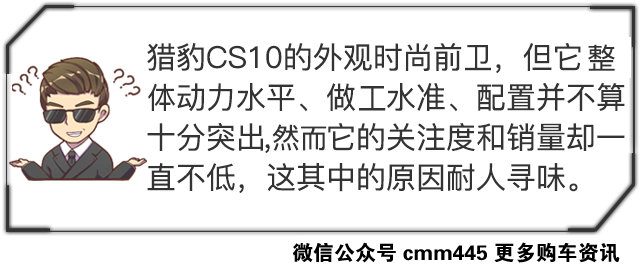 虎哥不说很多人可能并不知道,猎豹CS10在今年前4个月的月均销量已超过9000台,这让它能紧跟在哈弗H6、传祺GS4、荣威RX5的身后!它设计时尚饱满,车尾还给人一种保时捷SUV车型的错觉,外观的时尚度确实不错,此外较低的售价也是比较吸引的。