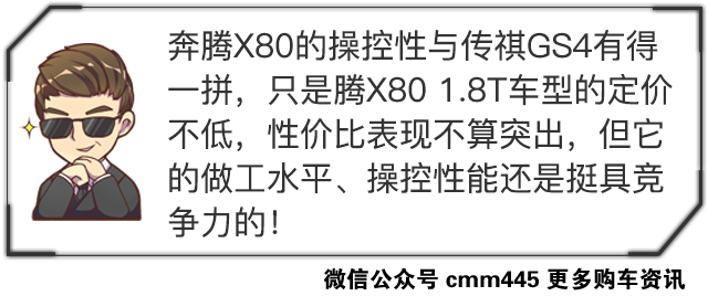 奔腾X80设计颇具动感而且原创程度高、整车做工也比较细致。底盘调校扎实、偏向运动性,它对转向时的侧倾控制得很好,但对于较大坑洼的过滤有些生硬。1.8T+6AT的动力总成,动力充沛并且响应快,只是油耗略高。