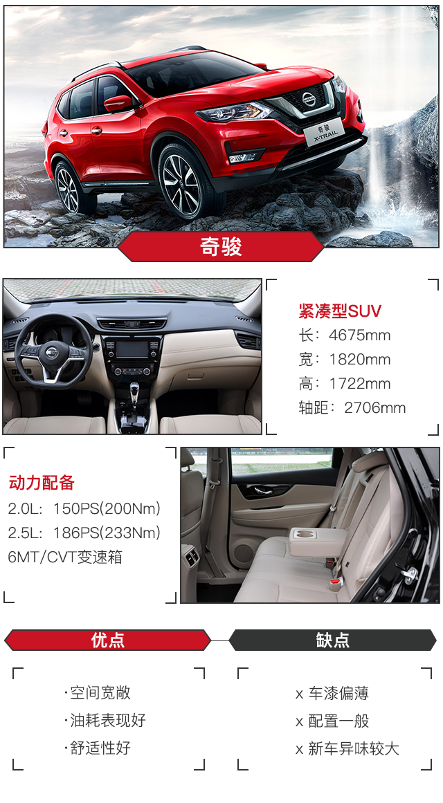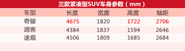 在东风日产旗下与奇骏同样定位于紧凑型SUV级别的还有逍客,另外小雅还拿来神车途观来做对比,三车尺寸参数一对比就立分高下,数据表明奇骏的尺寸已经远远跨出紧凑型SUV这个级别了。