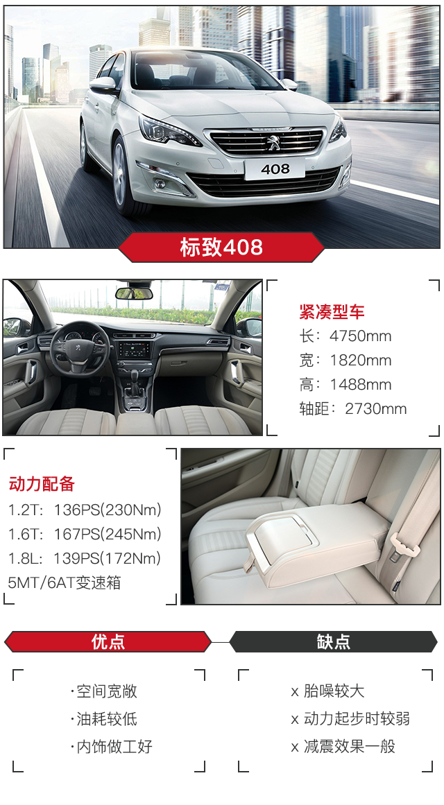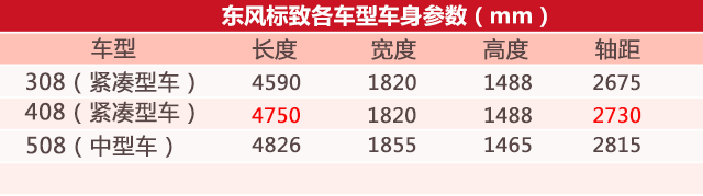 东风标致定位于紧凑型车的有308、408,但是从下面表中我们可以看出408的长度以及轴距都比308要大很多,已经接近中型车508的参数了。