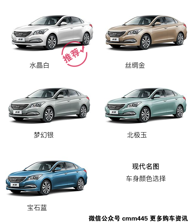 车主购买最多的颜色是水晶白。名图不像帕萨特、凯美瑞等带有行政气息的车,它主攻的是年轻家用车市场,因此白色的车身看上去更年轻动感。此外,名图还提供了许多个性化颜色供消费者选择,有宝石蓝、北极玉等,大家可以跟着自己的口味去选择。