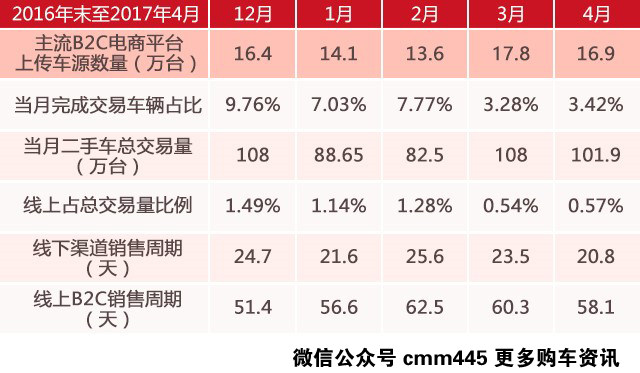 巨额资金融入、关注度极高、加上大力推广,二手车电商一副来势汹汹进入市场的模样,但实际表现却让人觉得“雷声大雨点小”。据中国流通协会的统计,4月二手车总交易量最高101.9万辆,仅仅占总交易量的0.57%。2017年1~4月平均线上B2C销售周期为59.375天,而1~4月平均线下渠道销售周期则为22.9天,线下渠道明显要比起线上流通速度更快,其实际表现远远低于我们的料想。