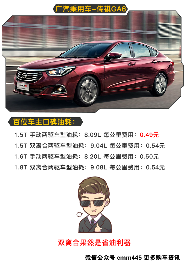 自主中型车来来去去就那么几款,而优秀的车型更是两根手指就数得过来,GA6算是其中一台。在一票国产厂商中,传祺对于双离合的调校还是较为令人放心的。GA6的油耗在双离合加持下,确实表现惊艳。但虎哥我还是希望将来能有更多的车型推出来丰富这个市场。