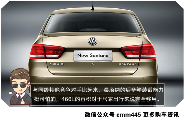 别看桑塔纳样子不大,后备箱的装载容积却达到了466L。要知道,同门胞兄捷达的后备箱装载容积仅为442L,劲敌科沃兹的装载容积也只有405L。所以说桑塔纳的后备箱装载容积还是非常出色的,居家出行游刃有余。