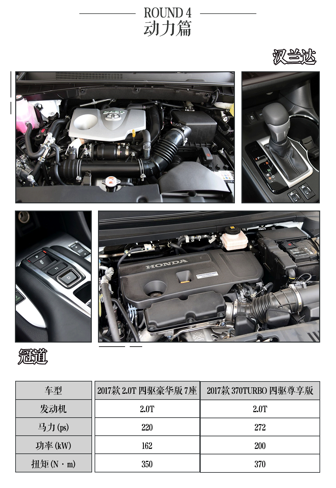汉兰达和冠道都定位为中型SUV,两车的整备质量分别为2070kg以及1866kg,相信大家第一时间肯定会问动力够不够,会不会肉。教授先下定论,两车在动力方面完全满足各位的需求。冠道的2.0T发动机是移植前驱神车思域TYPE-R的2.0T发动机,参数虽没有TYPE-R那般激进,但272马力是绝对充沛的,虽然它不能给予你多少推背感,但在中国路况完全能够满足你的超车需求。冠道还有1.5T的车型,入门售价更低,动力够用,十平八稳你也开不激进,这样的感觉就如2.0T的汉兰达差不多了。