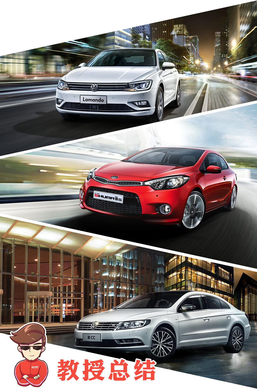 这三款车,风格各异,价位也不同,选哪一款想必大家都心里有数了,预算充足的,自然是大众CC,好开,动力足,又好看,但是有关注CC的朋友也知道了,CC即将换代,大家可以观望一下;预算不是很多的朋友,当然是凌渡了,颜值也是非常高,要求不高的,家用足够了;最后起亚速迈,这款车相对来说是比较个性的,这个无边框双门的代价还是有点点高的。