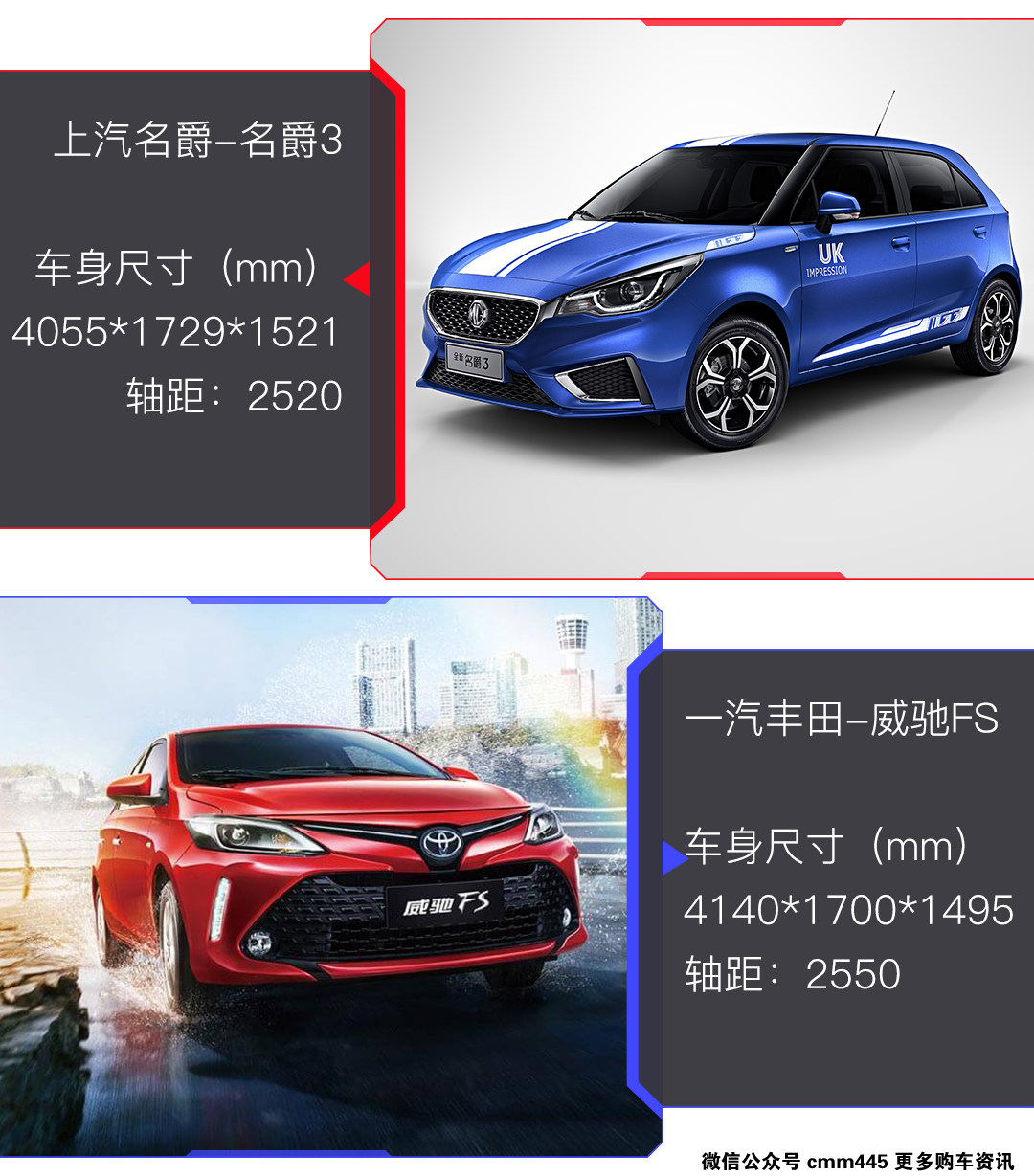 名爵3(MG3)历经中期改款后重新回到了公众的视线,外观层面巨大的革新程度是它最明显的变化;而威驰FS也带着丰田最新的keen look家族式设计语言进入市场,尽管一个自主、一个合资,看似差距挺大,但单从车型定位来看,两车确实可有一番争斗。