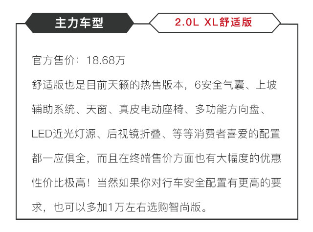 另外,天籁的配置水平也是相当高,在低配上大量标配的配置让它性价比十足,但是在2.0L的顶配版本上,加入了大量的高科技行车安全配置,这才是最吸引我们的地方,而该版本在不算优惠的前提下,车价也就19.64万,相比同级竞品车型来说,性价比更高。