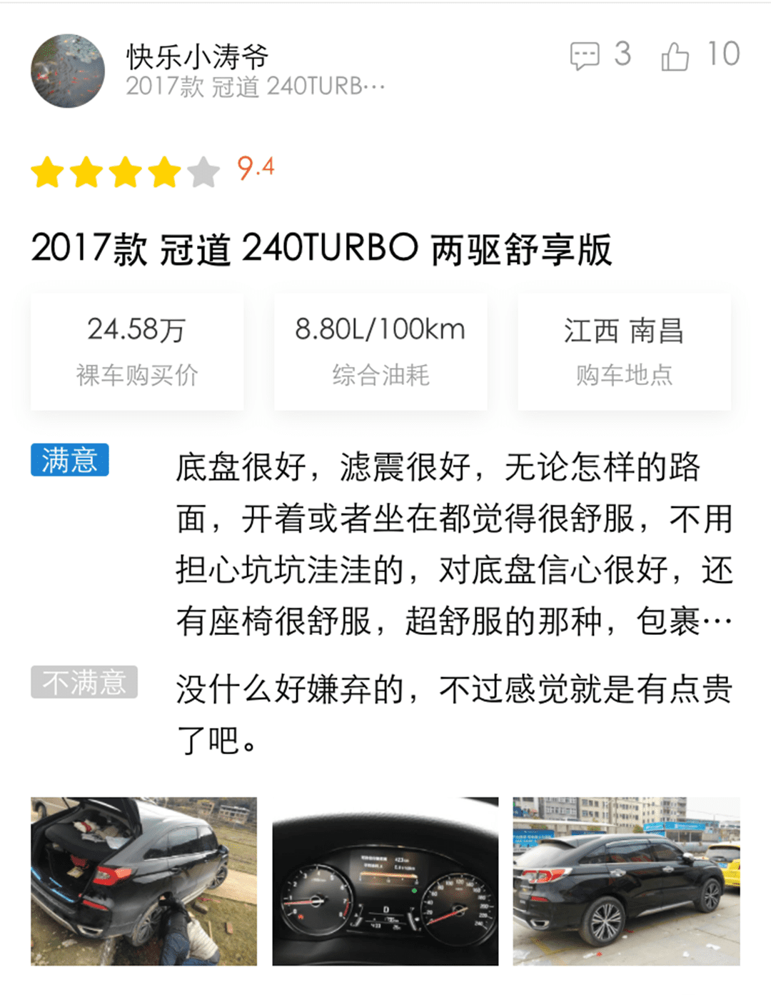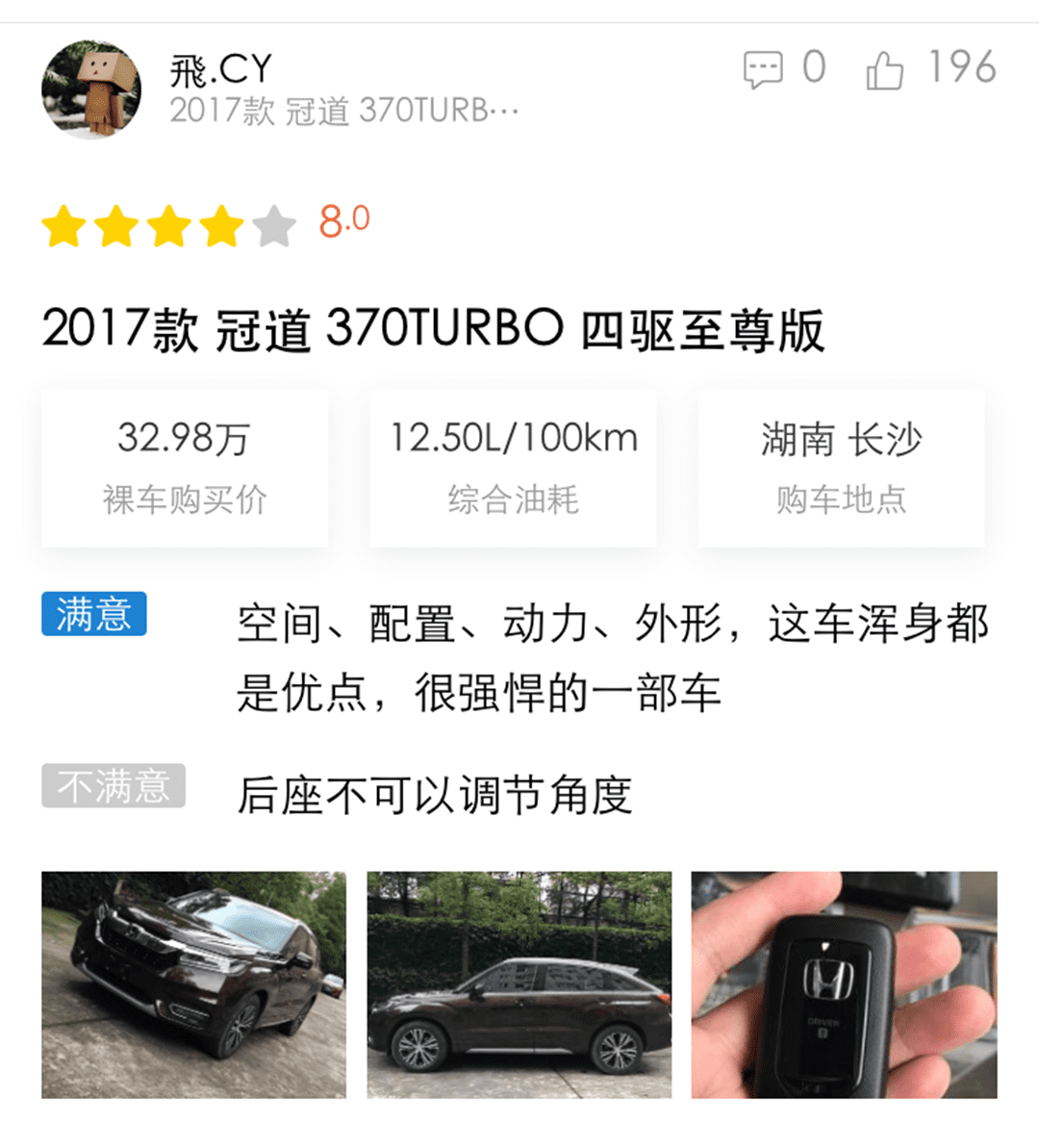 感兴趣的朋友可以点击小程序查看详细口碑。从口碑中可以看到,车主们都对冠道的空间、乘坐舒适性、动力都比较满意。而在细节上有小毛病和加价提车的问题上表示不满。