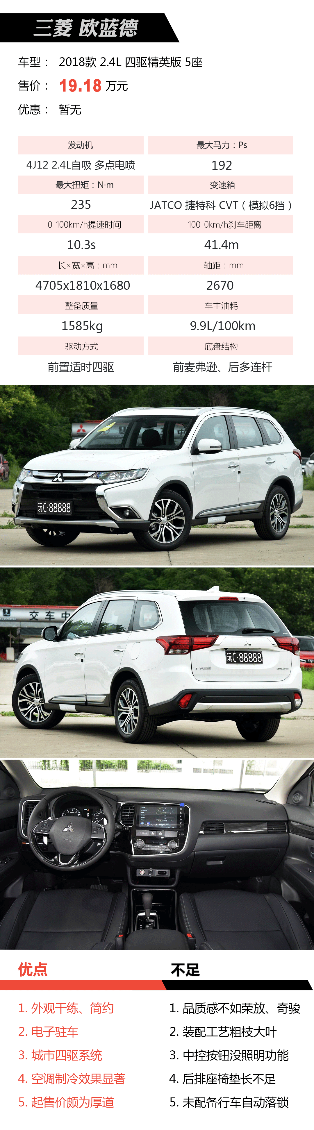 三菱在外观设计、产品营销方面大下苦功,辅以诚意满满的售价,欧蓝德收获喜人销量。最为人称道的莫过于2018款欧蓝德配备电子手刹,过去粗枝大叶的内饰装配亦有望得到改进。注意,此四驱非彼四驱,想体验三菱看家超选四驱找帕杰罗去吧。