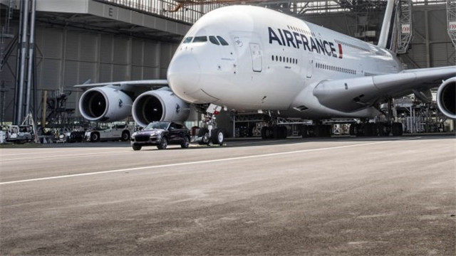 于是这台最大扭矩为854牛米的柴油版卡宴S很轻松的就把这台飞机拉出了停机位。而第二台挑战的是汽油版的卡宴Turbo S,虽然汽油发动机扭矩较小,可是这台Turbo S的扭矩也高达800牛米,也轻轻松松地把这台法航A380拖行了40多米。