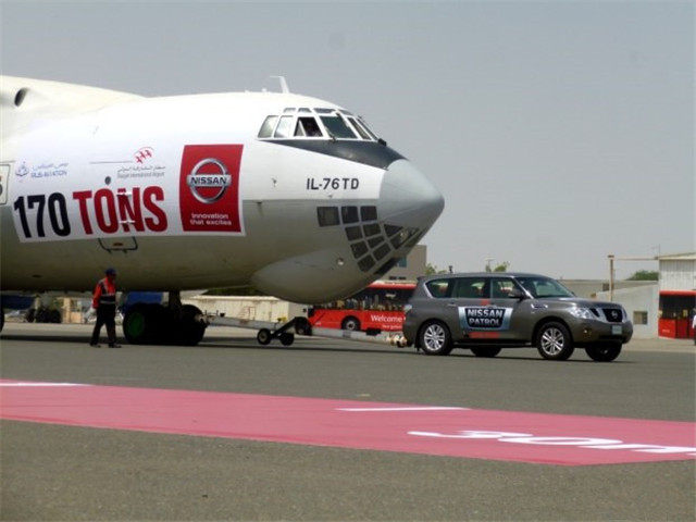 人家日产直接就不跟客机一起玩,而是直接拉了一辆俄罗斯的看家运输机——伊尔-76,总量达到了170.9吨,而且拖动了四十米,一举打破了当时的途锐的记录。