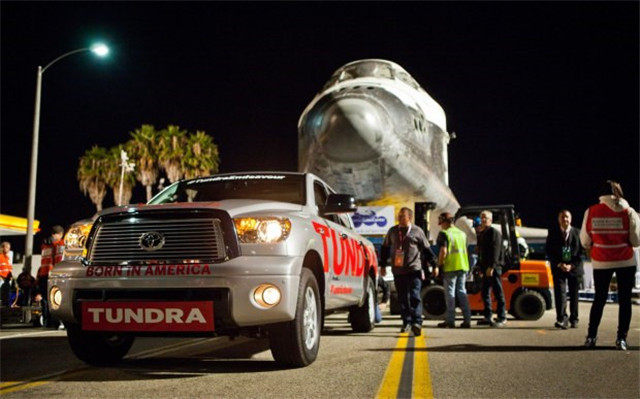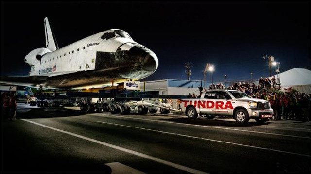 2012年的时候,丰田坦途也来凑这个热闹,当时正值美国的航天飞机退役,刚回到地球需要拉回加州科技中心安放,距离19.2公里。于是汽车就成了这个运输任务的最佳选择,丰田主动请缨:让我的坦途出战吧!