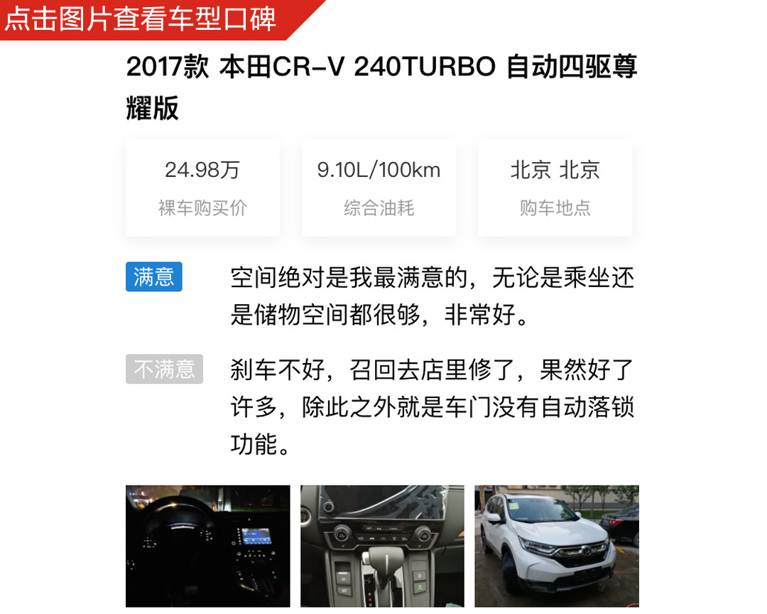 其次是品牌因素,CR-V全称Comfortable Runabout-Vehicle,从名字就可以看出这款车对于舒适性的重视,定位为城市SUV,从第三代开始就已经在城市SUV当中取得非常不错的口碑,在同级别当中实力是相当强的,是标杆级的车型。