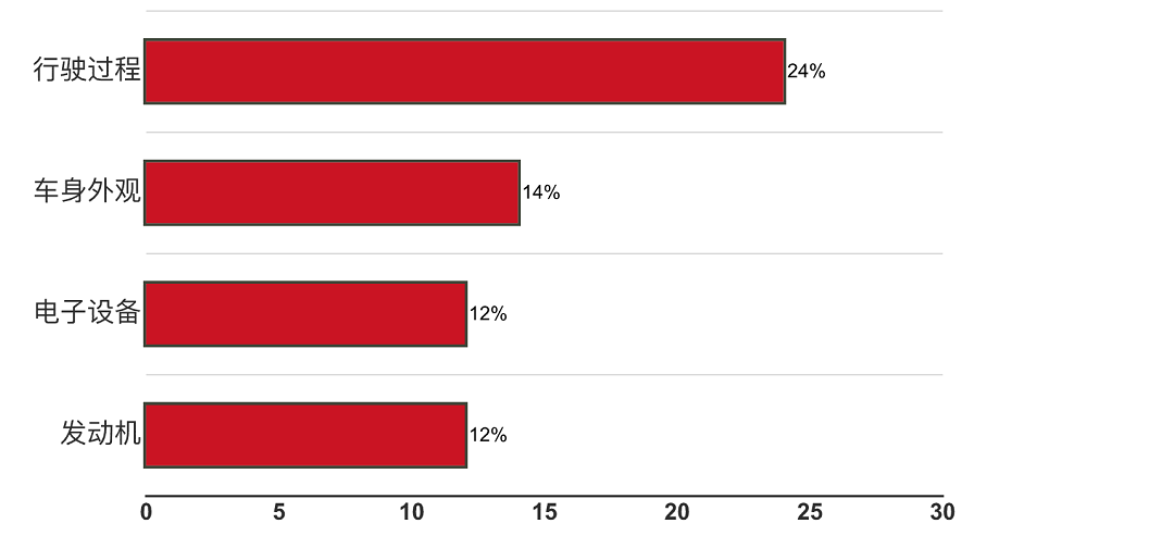 据新车质量研究显示,70多位车主当中,行驶过程和车身外观方面占24%和14%,怠速时会有车身抖动的情况,路噪声、车身周围风噪过大等问题。