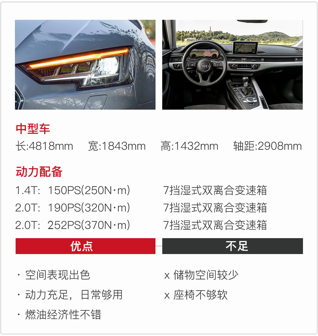 动力性能方面,购买奥迪A4L的消费者应该都不会很追求动力,都是用作家用或者商务,相信即使低功率的2.0T也是足够使用了,另外,新增了30TFSI车型,搭载1.4T发动机,7速双离合变速箱,进一步拉低门槛。