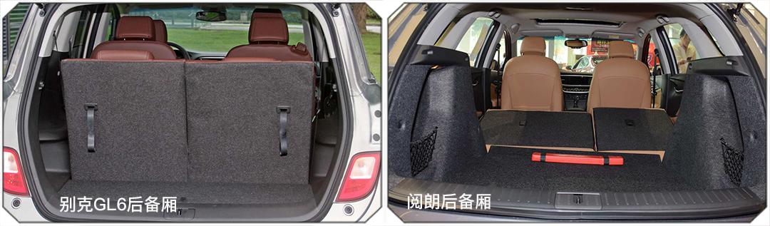 至于后备厢容积嘛,GL6常规状态下的后备厢估计只能放书包等小物件,不过放倒第三排座椅容积得到扩伸;阅朗的后排座椅可按4/6比例放倒,但是存在一个小的坡度。