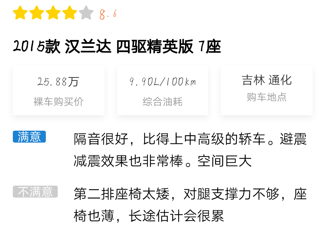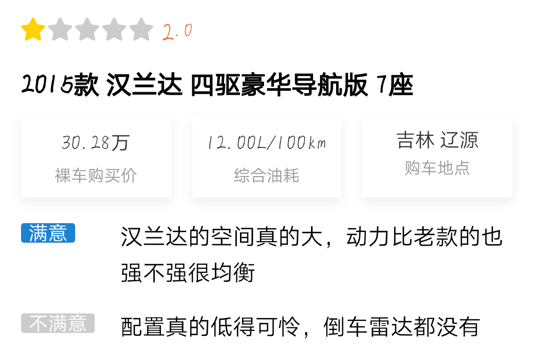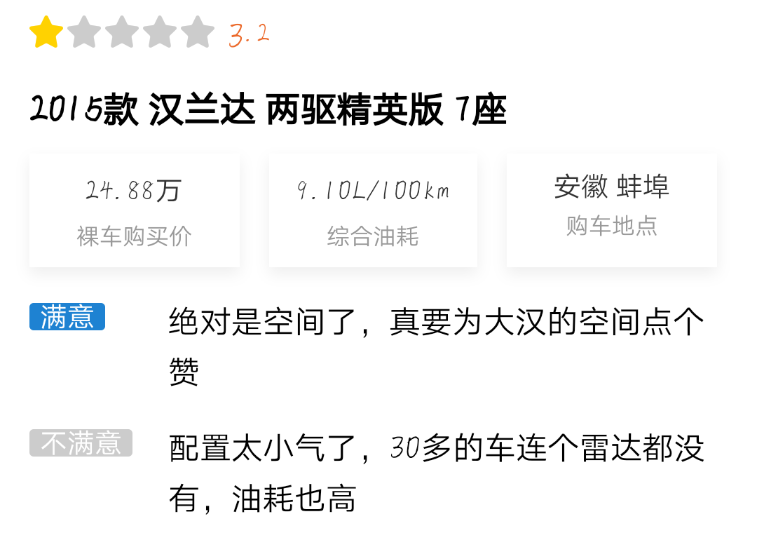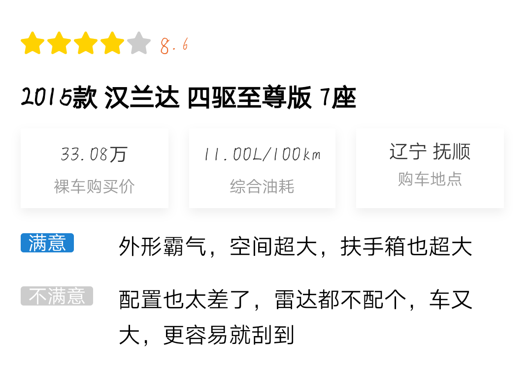 感兴趣的朋友可以点击小程序查看详细口碑,从口碑中可以看到,车主们都在称赞其外观霸气以及乘坐空间大,同时也在吐槽它的配置不高。