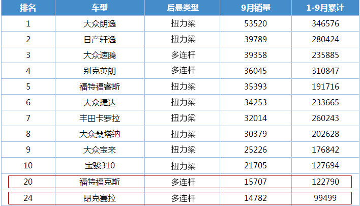 马自达把多连杆换成扭力梁的确是一个比较有争议的选择,毕竟在很多人心目中扭力梁就是低端和弱鸡的代表,然而,卖得最好的却又是采用扭力梁的车型,从9月的销量来看,昂克赛拉的销量已经算不错了,但跟使用扭力梁的朗逸相比,中间差了一个同样采用扭力梁的轩逸。10来万这个价位采用多连杆独立后悬的紧凑级轿车并不多,而且采用多连杆后悬的福克斯销量也远不如使用扭力梁的福睿斯。