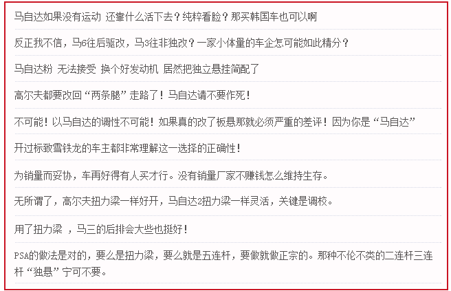 然而,从网友的反应来看,大部分是质疑的声音,毕竟喜欢马自达的多数是因为情怀和信仰,不过也有表示理解的。马自达如果在国内力推扭力梁非独立后悬挂,又没有大众和两田那样的品牌属性加成,前途貌似很堪忧。不过小虎开始的关注点还是放在那台第二代的创驰蓝天发动机上,丝毫不觉得运动性会有多大影响,毕竟马自达也说了以后不再生产最不运动的MPV车型。