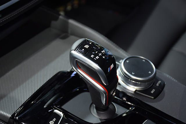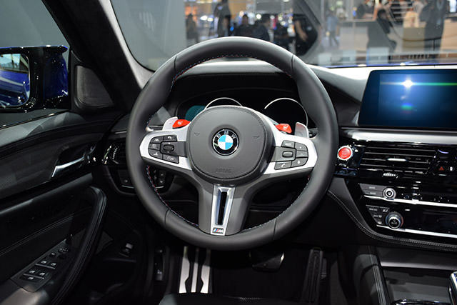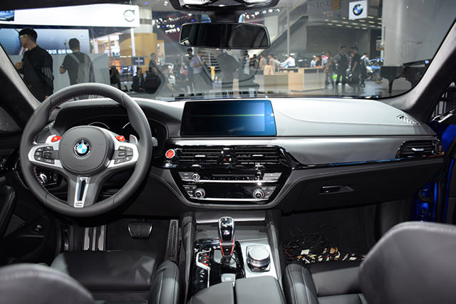 内饰方面,宝马M5使用的是M系的方向盘,唯一有所不同的是方向盘后面的换挡拨片使用了醒目的红色。而且档把上也印有宝马的"M"LOGO。
