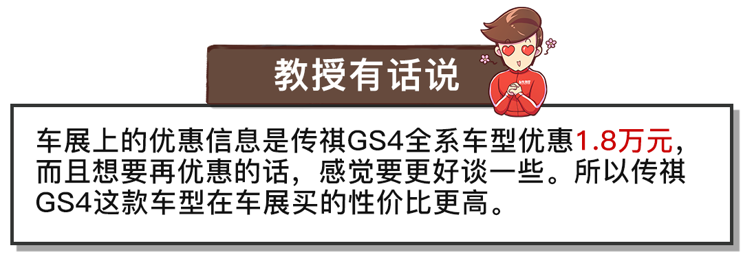 当然,教授这次是来“买”传祺GS4的!我认真地围着传祺GS4转了一圈后,便直接询问销售小哥在车展期间这款车型能有多大优惠。