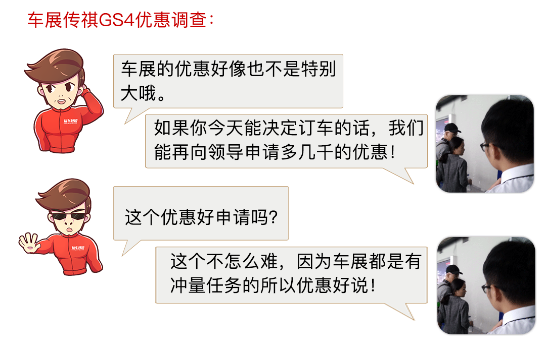 这个没拍到正面的小哥说车展期间传祺GS4车型限时优惠18000元,并且赠送礼品四件套包括行车记录仪、脚垫、防爆膜、灭火器,而且这个优惠幅度还有继续谈的空间。