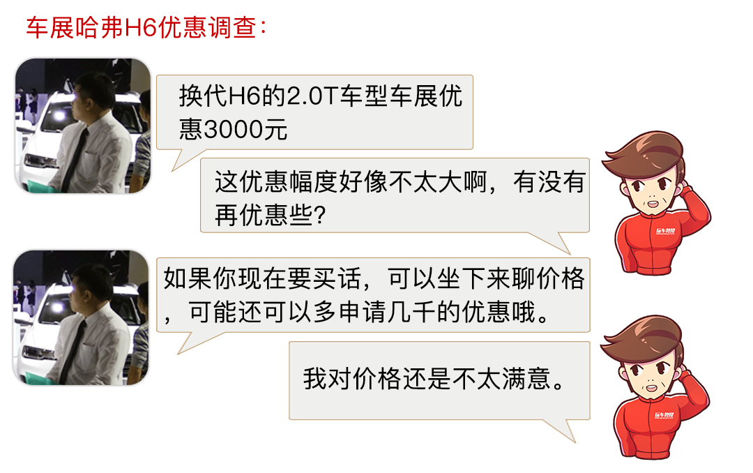 再来看看销量逆天的哈弗H6,在展台上正有不少人都会看这款车型,教授直接找到销售询问哈弗H6 2017款 换代2.0T车型的优惠幅度。