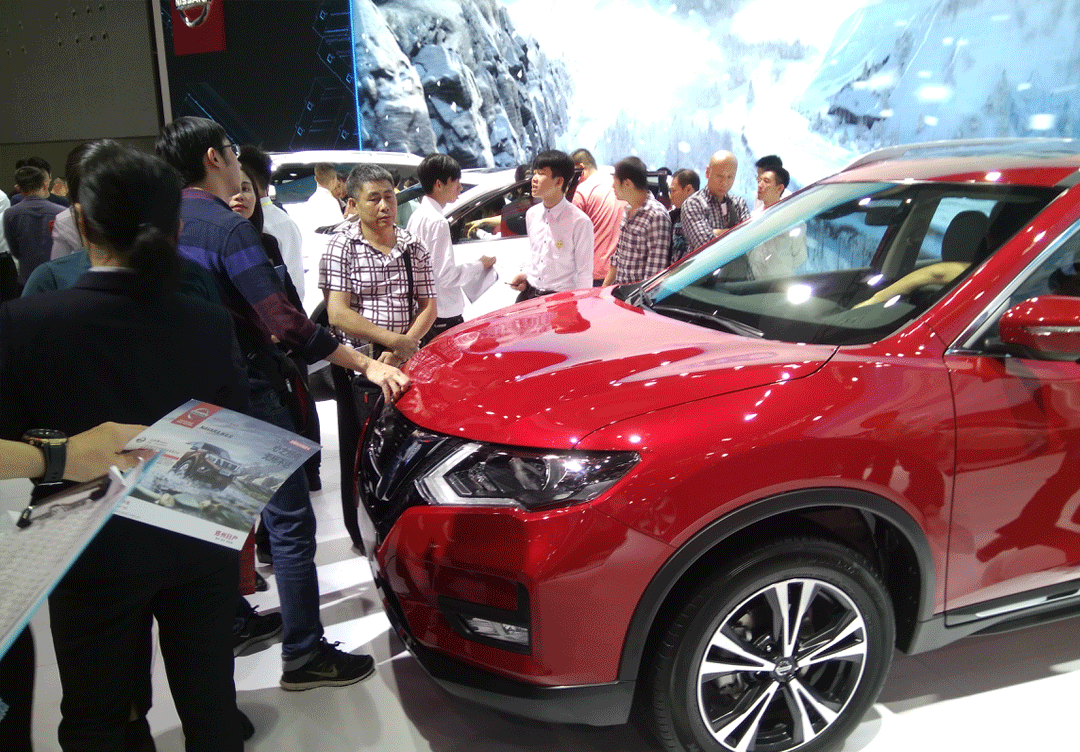 日产展台非常热闹,教授要看的奇骏被很多男士包围着,各个销售员也忙得不可开交!
