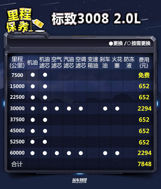 教授总结:标致3008的保养间隔为7500公里/次,相比同级别对手有一定的优势。小保养的价格为1.6T车型591元,2.0L车型652元。行驶6万公里的保养总费用分别为8167元和7848元,1.6T车型的保养表现在同级别中并不算低。1.6T车型和2.0L车型的年养车费用分别为22853元和24788元,整体表现正常,稍高于日韩系车。