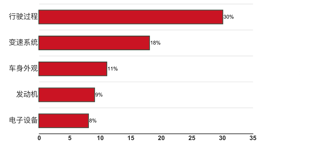 60多人的反馈中,行驶过程中的问题比例最大,存在着怠速抖动、胎噪过大、刹车力度不足等毛病,另外起步也是比较慢的,给油需要舍得一点。