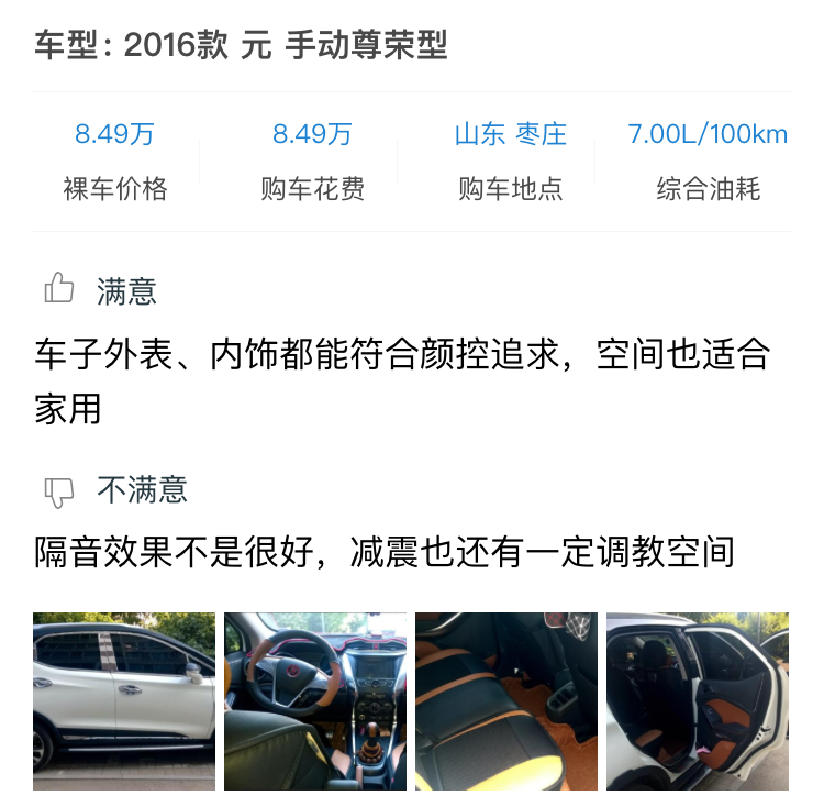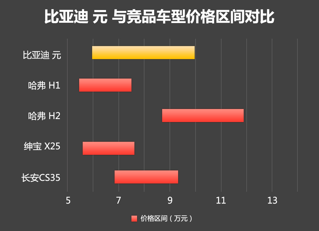 元的主要竞品是自主小型SUV,车主考虑过的车型当中哈弗H1、H2占比约二成,H1跟元相比主要优势在于定价,7万顶配,元起步就6万了,然而其实一看外观就很容易排掉H1,在自主小型SUV当中元的外观是最好看的几款车型之一。