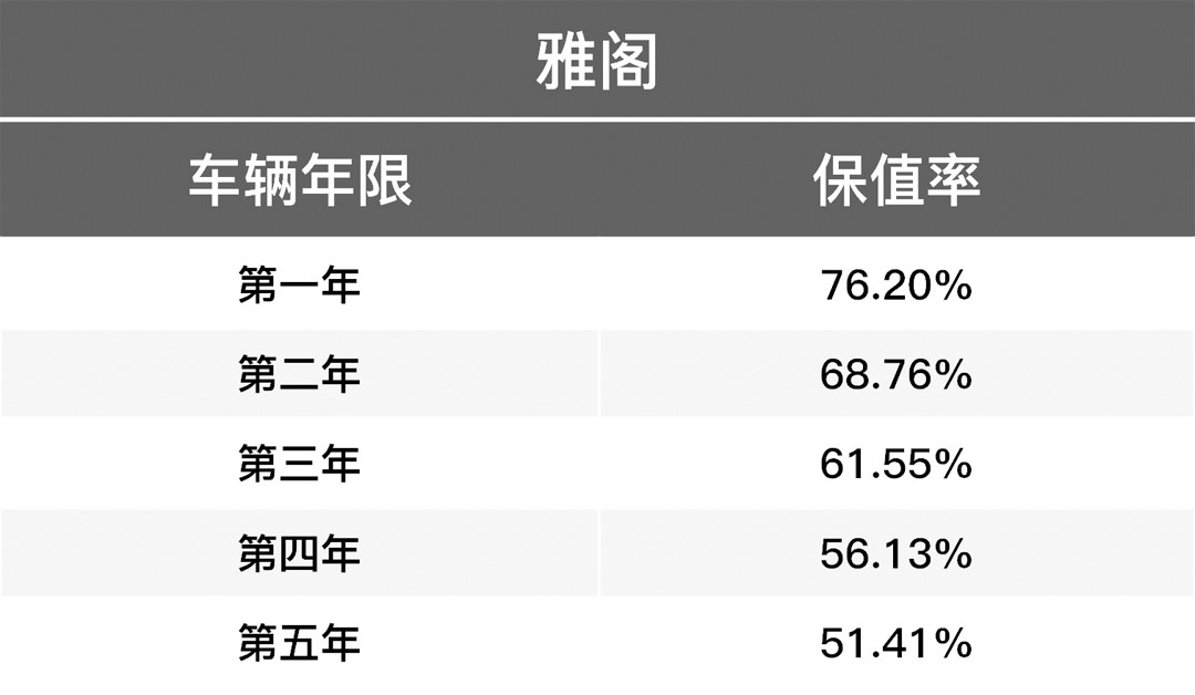 雅阁保值率同样也是较高水平,每年下降的幅度也不大,到了第五年还有超过50%的保值率,表现棒棒哒。