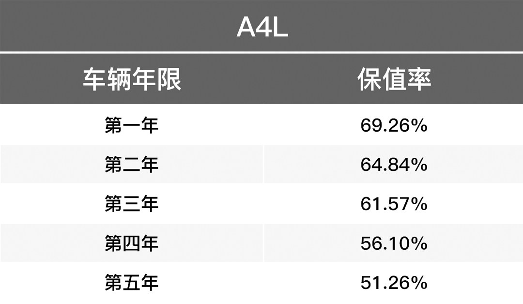 豪车的保值率向来都不低,A4L第一年保值率不算高,但是每年降幅非常小,到了第五年仍然有51.26%的保值率,表现尚可~