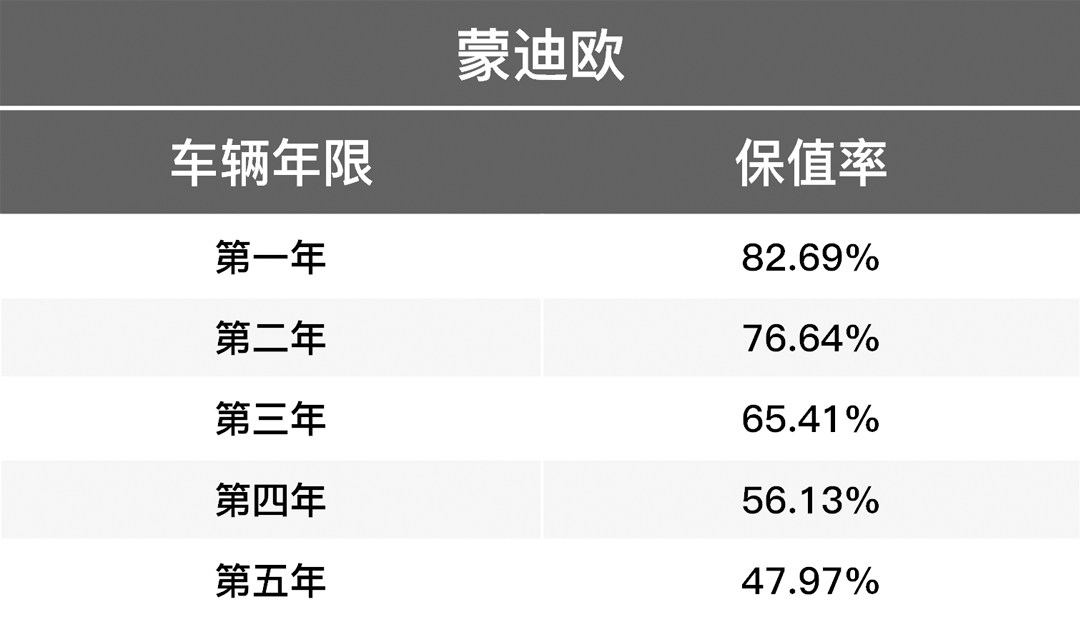 从表格中我们可以看出,蒙迪欧的前四年保值率还是相当可观的,但是每年的降幅还是比较大,第五年保值率也是低于50%,跟名图同病相怜呀。