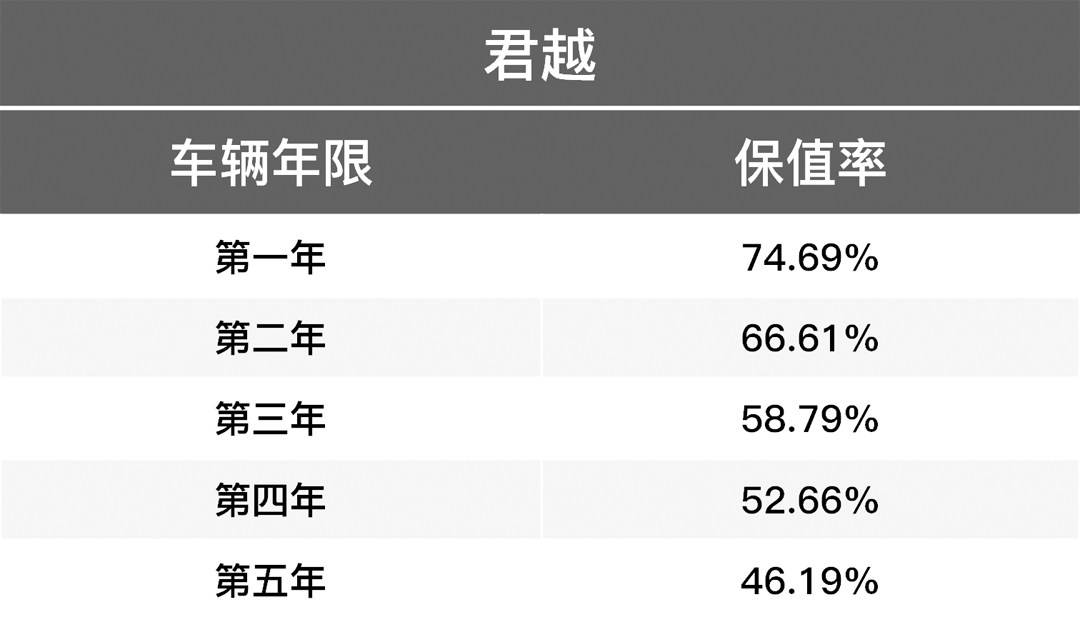在保值率上,君越也是前四年保值率较高,第五年也跌出50%大关剩下46.19%,但是君越性价比还是非常高的。