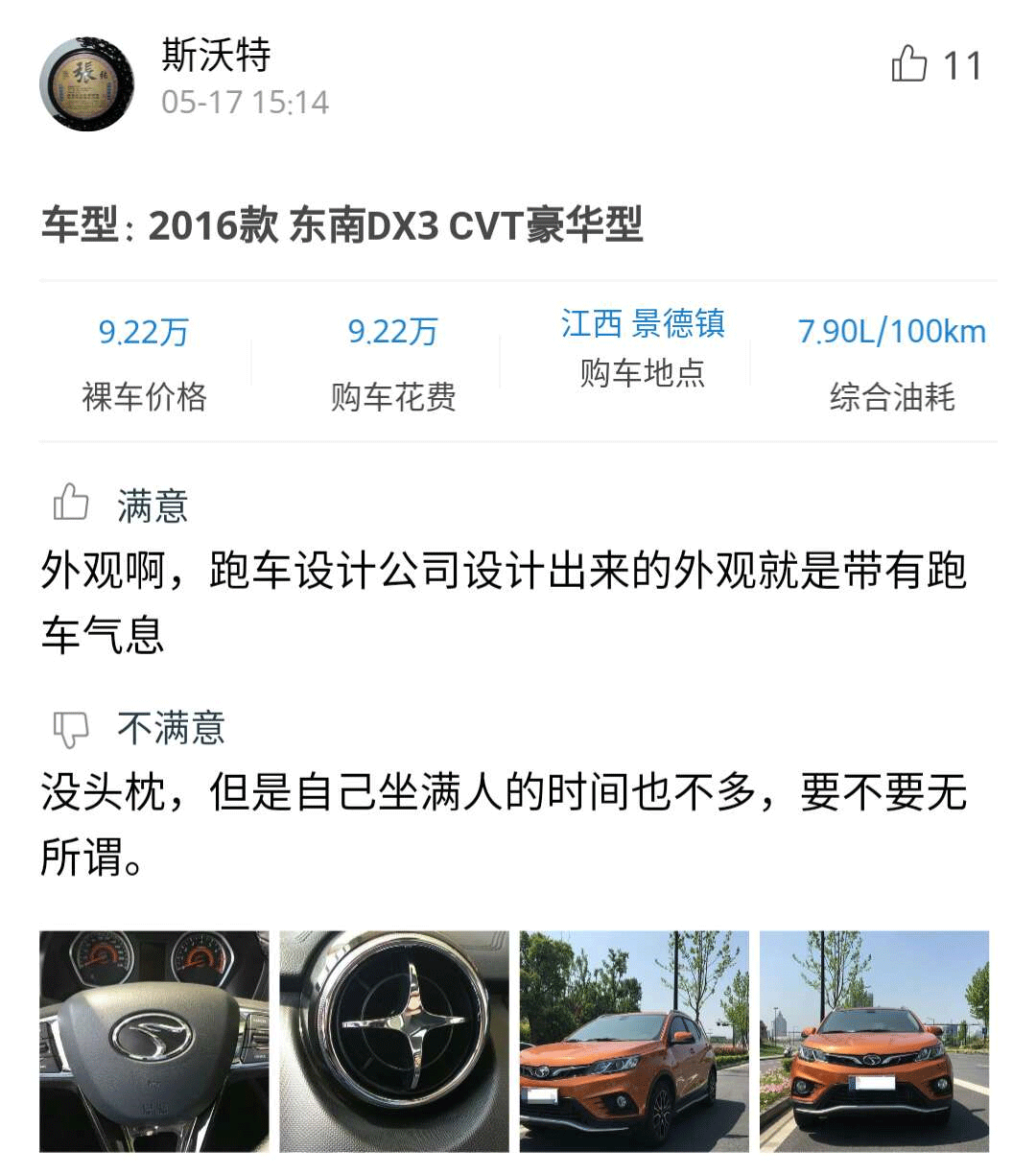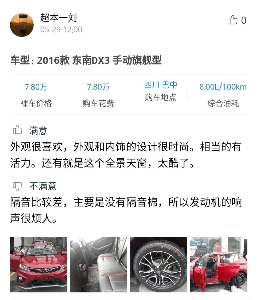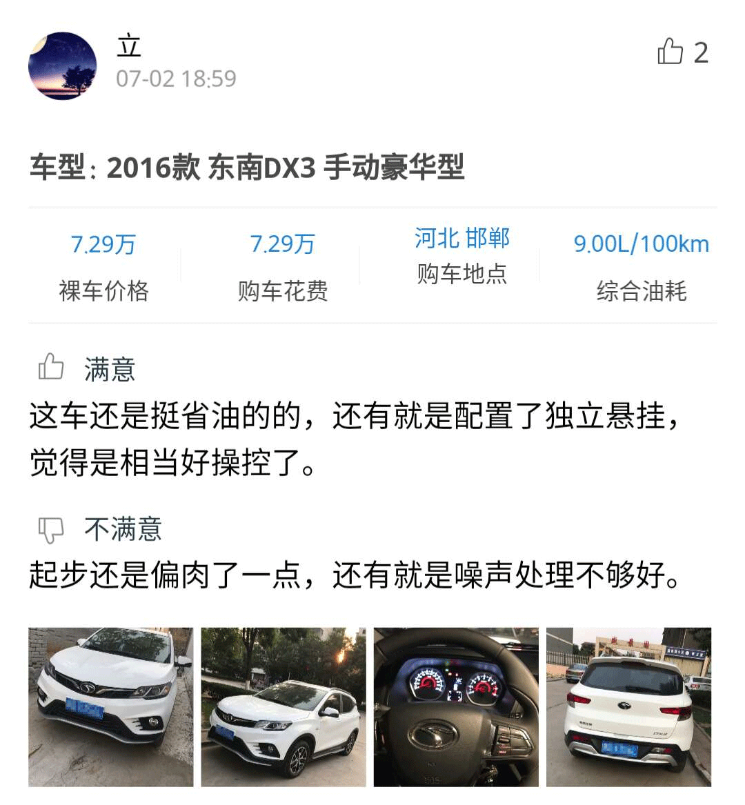感兴趣的朋友可以点击小程序查看详细口碑,从口碑中可以看到,车主们对东南DX3的动感造型,全景天窗这项配置,还有四轮独立悬架带来的良好操控感受颇为满意,但是在起步动力和发动机的噪音等方面有些不满。