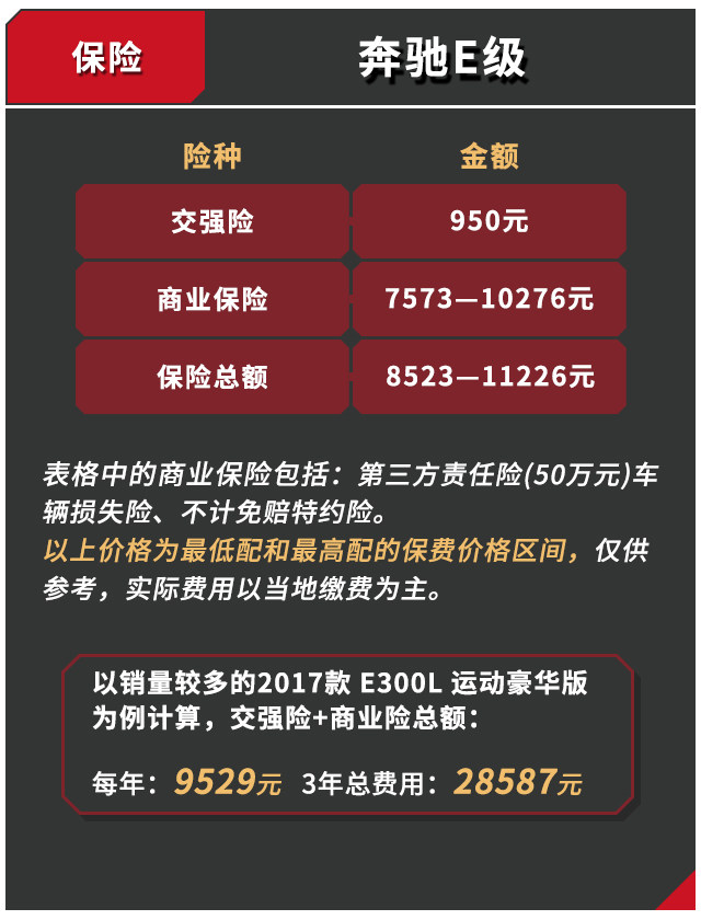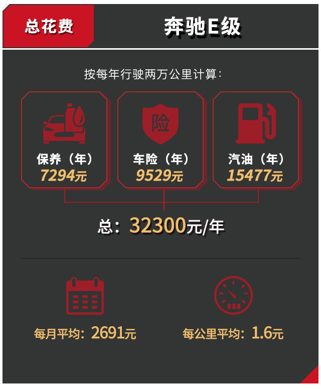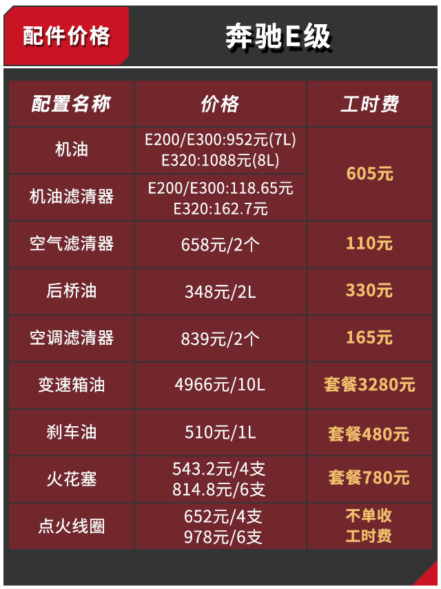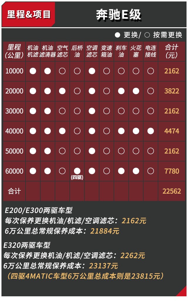 值得注意的是:E级目前部分地区是有厂商的售后增值礼包,售后增值礼包是3年4万公里免费保养,免费保养项目包括机油/机滤/空滤/火花塞/工时费等,总结能至少节省1万元以上,这样三年里的总保养费用则可以降低不少,不过由于各地政策不一,教授这里暂不统计优惠费用,各位购车时最好问清楚有没有增值礼包。