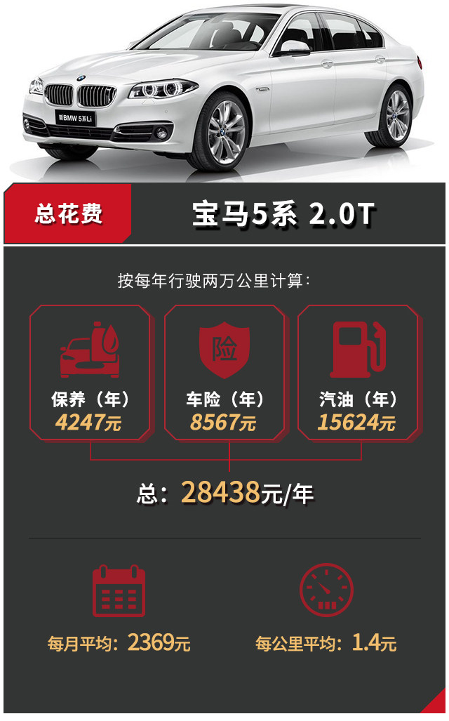 与2016款的宝马5系2.0T车型作对比,车险和油费相差不大,保养费用则比E级低了一些,5系的保养间隔为5千公里,两者的一年花费差距为几千。