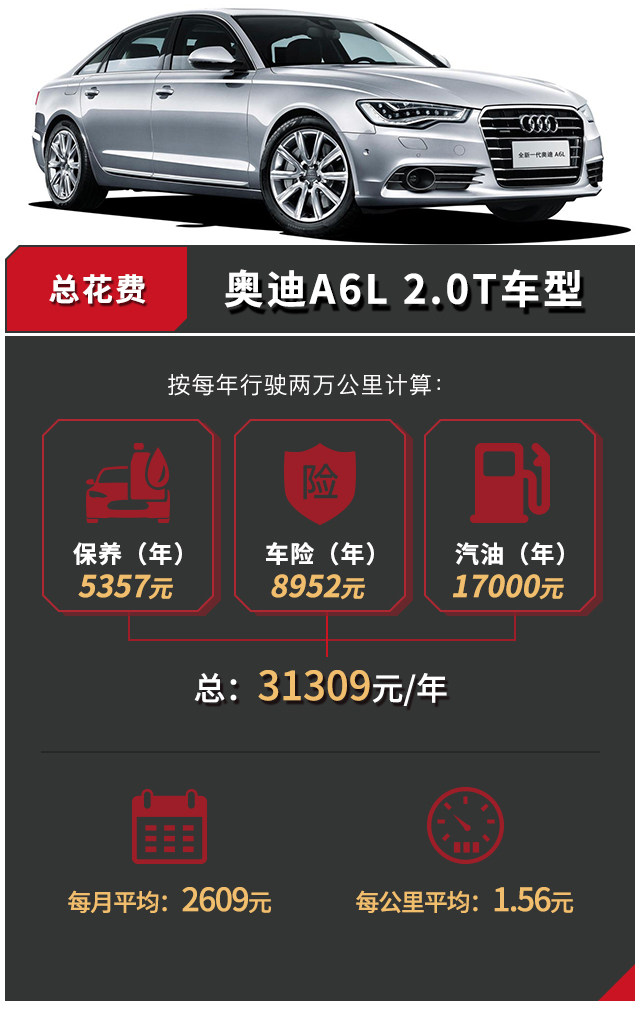教授之前的文章统计过奥迪A6L,一年总费用是3万多点,A6L这款车优惠是挺给力,但是保养费用跟奔驰差不多了。