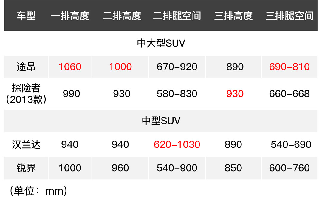 大尺寸的车身还需要合理的布局设计来营造用户的乘坐空间,途昂和市面上其他7座SUV车型的空间数值相比起来,前两排头部空间有着明显优势,第三排的腿部空间也表现优良。